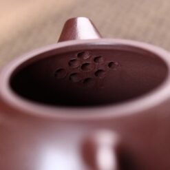 Chiếc ấm có dung tích 250ml, phù hợp cho những buổi thưởng trà thân mật. Thiết kế vòi 9 lỗ giúp nước trà chảy đều, mượt mà, mang đến trải nghiệm pha trà hoàn hảo. Hình dáng tổng thể của ấm tử sa được thiết kế đơn giản nhưng tinh tế, tạo nên sự cân đối trong từng chi tiết.