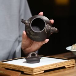 - Họa tiết trên thân ấm được chạm khắc thủ công bởi nghệ nhân lành nghề, thể hiện sự chăm chút trong từng đường nét. Màu sắc của chất liệu đất hắc nê nguyên khoáng trầm ấm tạo cảm giác nho nhã và sang trọng cho người sử dụng.